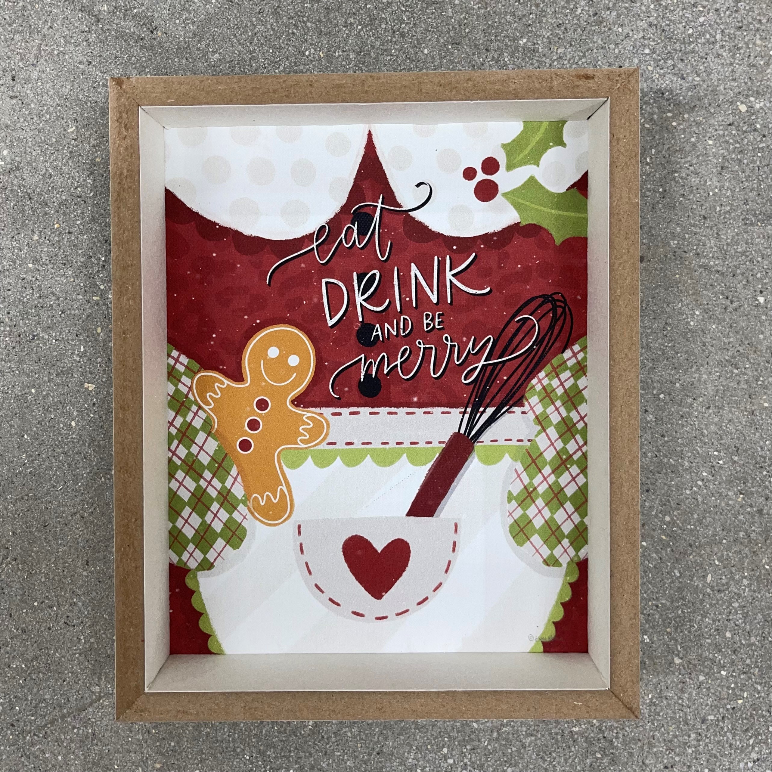 Add a touch of holiday cheer to your home with our Be Merry Framed Canvas Print. This charming 6.5x8x1.5-inch print features the festive message 'eat, drink, and be merry', making it a perfect addition to your kitchen or dining room decor. Complete with a whimsical gingerbread man and a whisk design, this framed canvas print will bring joy and warmth to your space.
