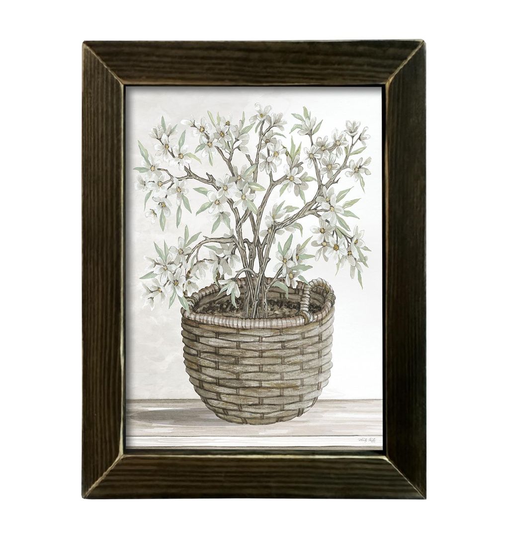 This picture is called "Basket of White". The print unframed measures 18x24 inches. The frame will add about one more inch per side. Beautiful print with multiple frame selections to choose from. This picture has a beautiful brown woven basket with a small tree with small white flowers. The entire print has subdued tones making it the perfect choice to blend in with any farmhouse decor. Choose your lath frame color to customize your product. All frames have a vintage wire along the top of the frame for quick and easy wall hanging.