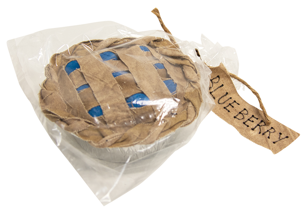 This Mini Blueberry Pie is stuffed fabric with a classic aluminum pie pan. Comes in a plastic pouch tied by a jute string and a fabric tag which reads "BLUEBERRY" in handwritten lettering. The pie is made of rustic, tan fabric and blue puff balls for a handcrafted look. This decorative item has the charm of a country bakery and will be perfect in a primitive inspired kitchen display. Measures 5" in diameter by 2" high.