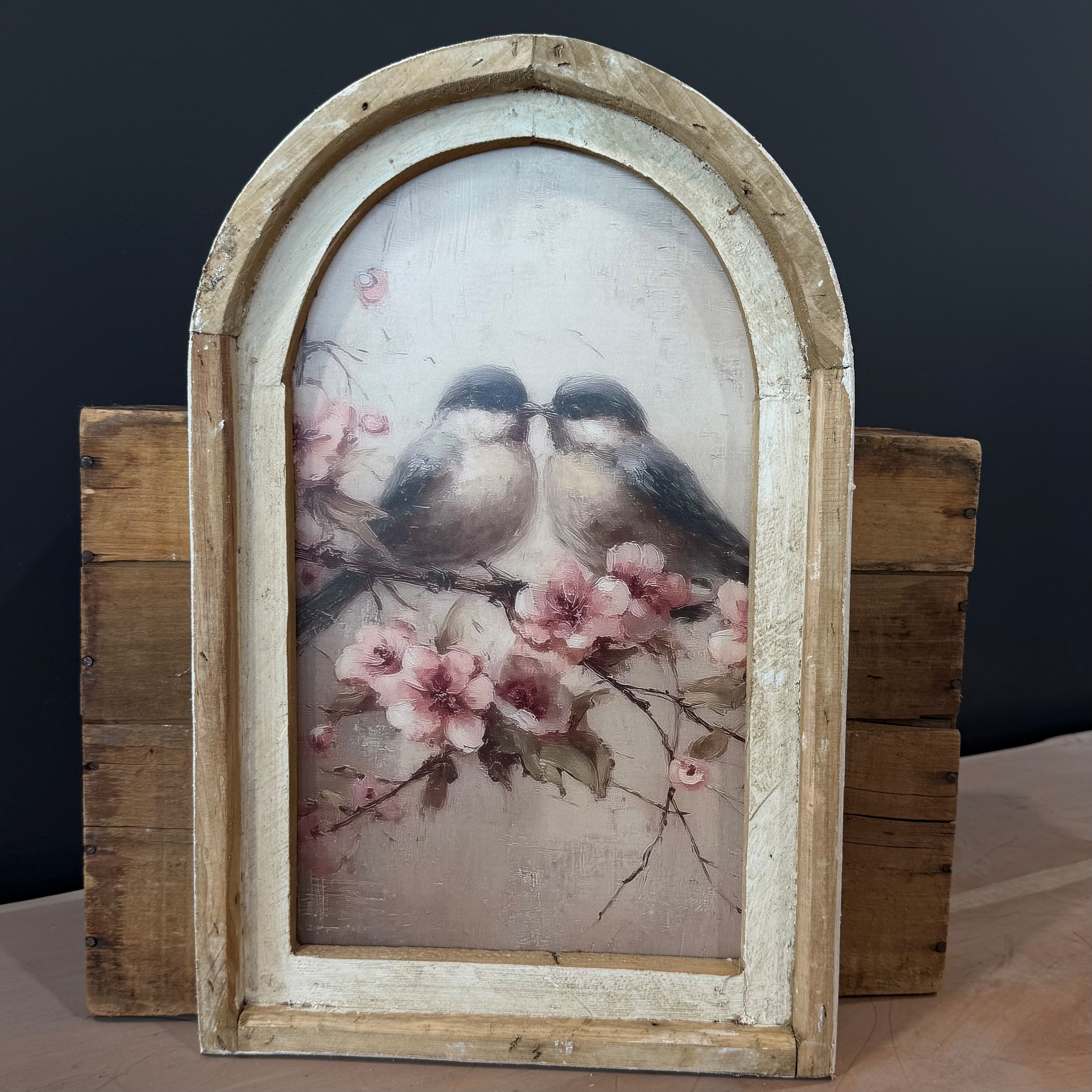 Bring timeless charm and soft romance to your space with the Vintage Blue Birds Arch Frame. This beautifully shaped 12x20 inch wall piece features two delicate blue birds perched closely together on a blooming branch of blush-toned florals, set against a warm, textured background. The gentle color palette and painterly detail create a serene, nostalgic feel that complements both traditional and cottage-inspired interiors.