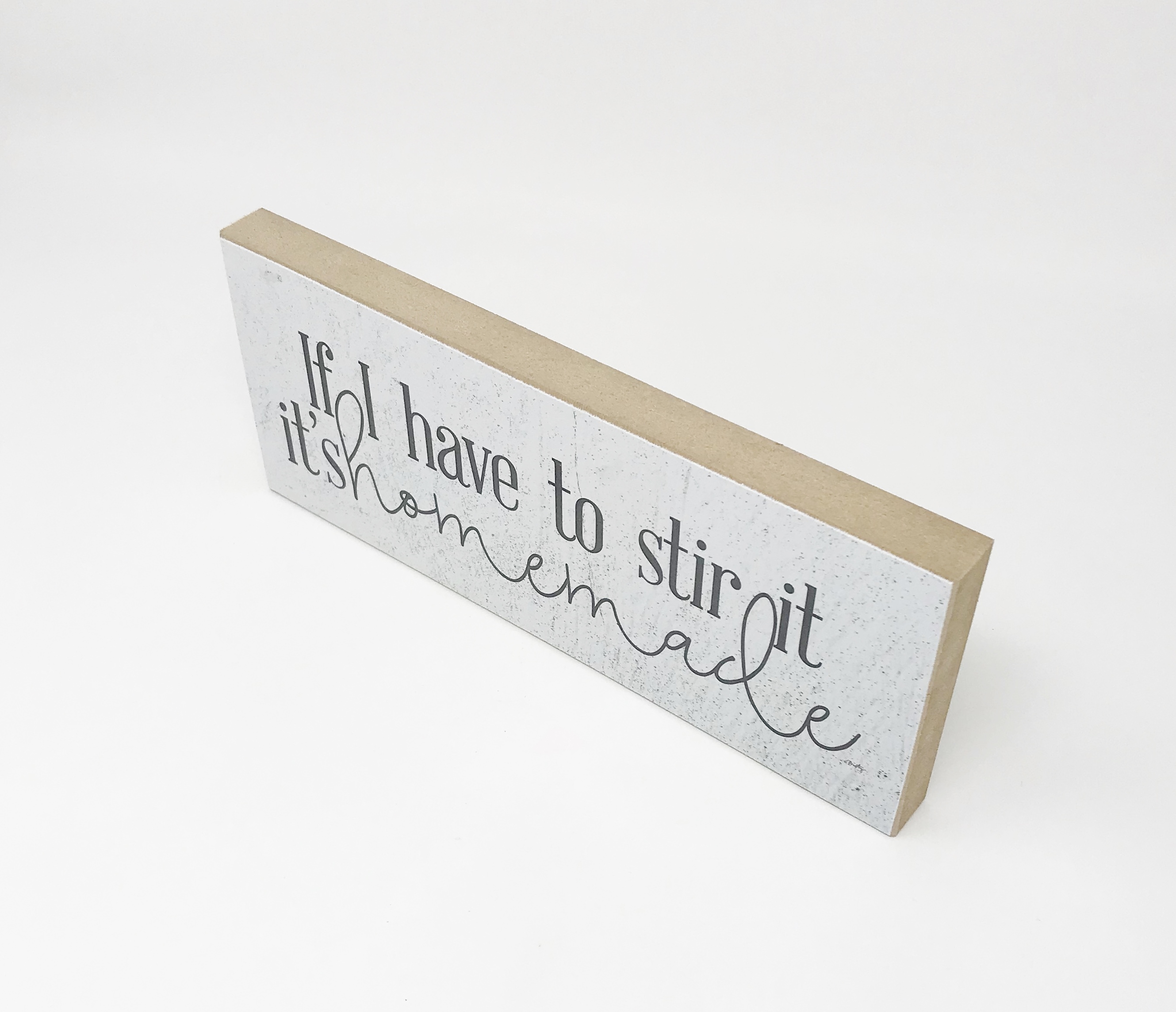 Add a touch of humor and warmth to your kitchen decor with the MMD400A Homemade Block. This charming white block features the playful phrase 'If I have to stir it it's homemade' in classic black font, making it a delightful addition to any home.