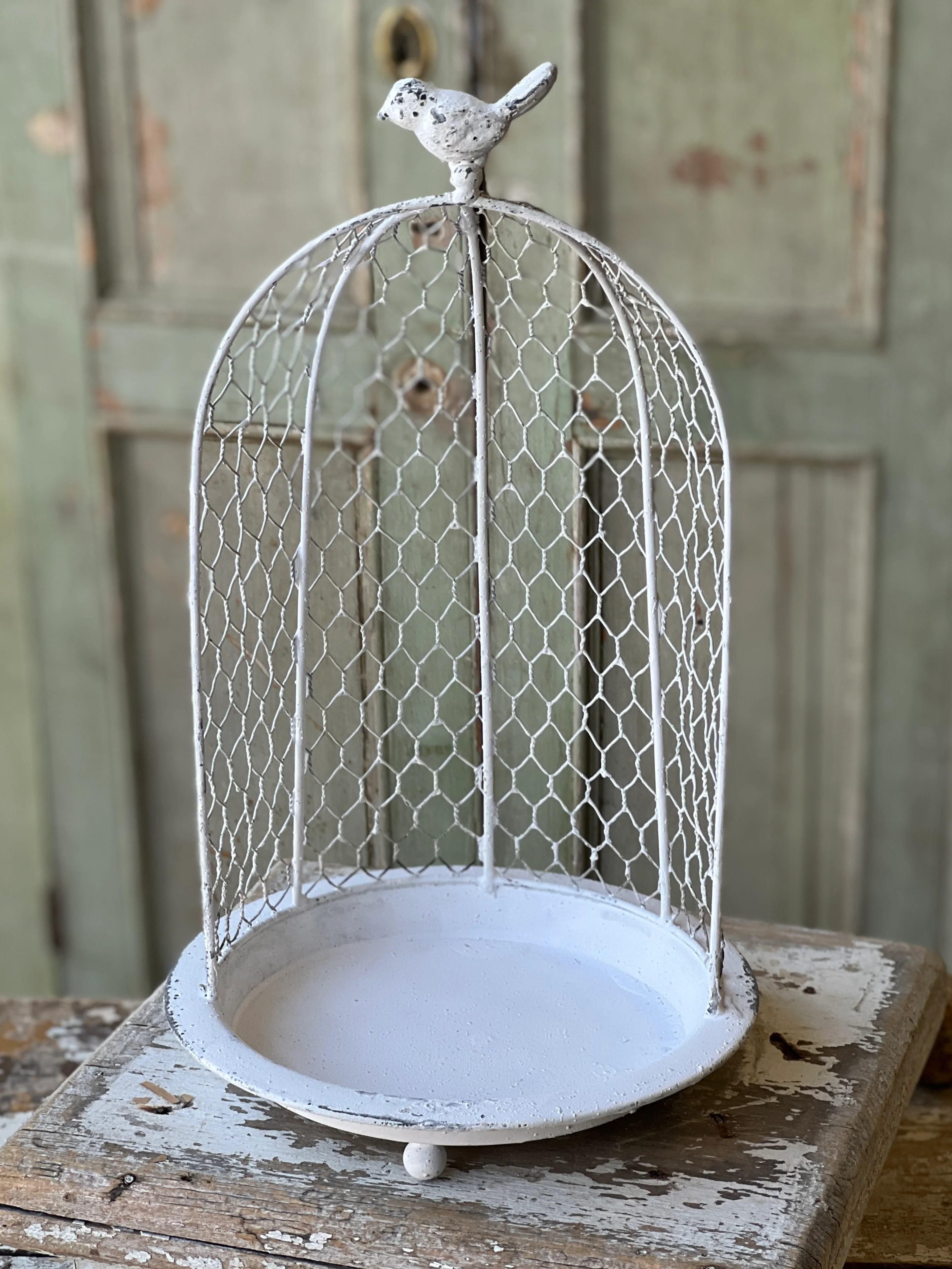 Product Description A unique wire cloche with a footed base and distressed finish that is made even more charming with a decorative bird perched�on top.�