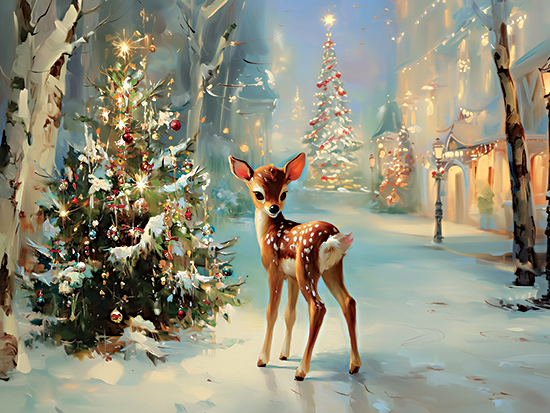 Add warmth and holiday cheer to your home with "Winter Wonderland Fawn", a charming Christmas print featuring a sweet baby deer in a snowy, twinkling holiday street. Surrounded by decorated Christmas trees, glowing lights, and a magical winter atmosphere, this piece blends seasonal beauty with a touch of woodland whimsy.